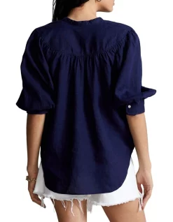 Best Sale π Polo Ralph Lauren Shirred Linen Top In Navy Blue π