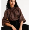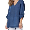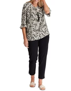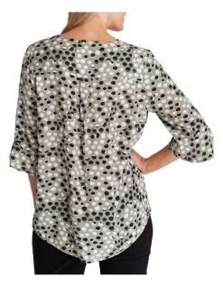 The Jemima Blouse is a must-have for any fashion-savvy woman. Made from a luxurious blend of rayon and viscose, it features a flattering 3/4 sleeve with frill cuff, spot print, and V neck with buttons. The back yoke with pleat and curved hem create a beautiful silhouette that is sure to turn heads. Whether you dress it up for a night out or keep it casual for a day at the office, this blouse is sure to make a statement.