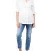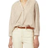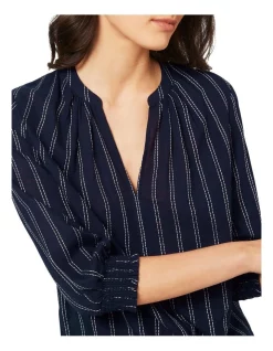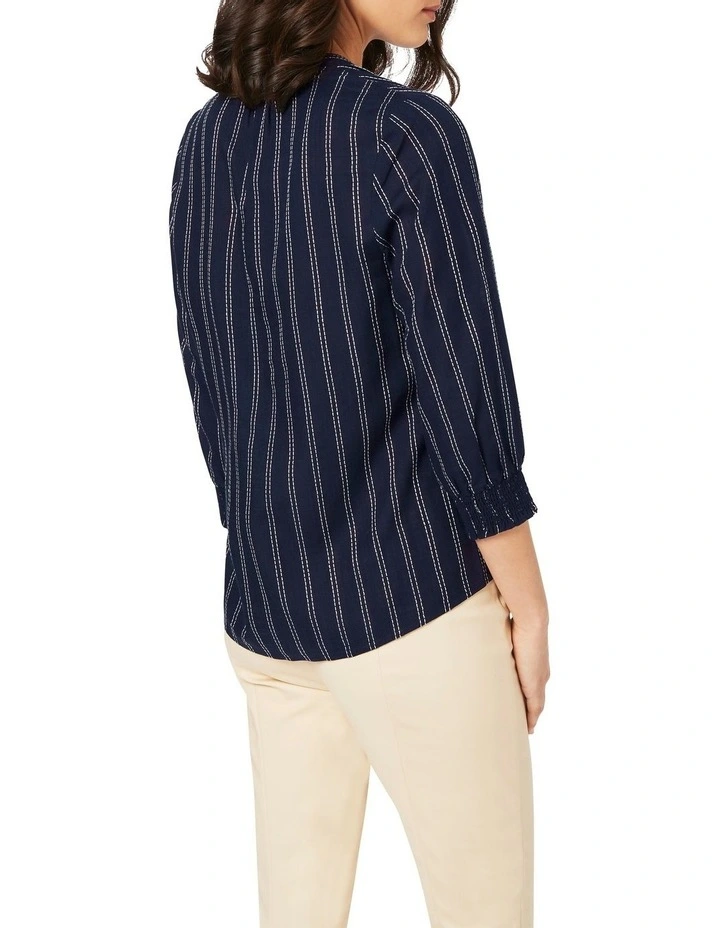 Drawing the eye to its textured stitch stripe, this blouse plays ivory against navy within a lightweight viscose and cotton blend fabric. Creating an effortless relaxed fit with an open V-neckline and mandarin collar, the blouse features curved shaping through the hem, and three-quarter length sleeves with shirring at the cuffs, which allows them to be worn pushed up for a puff sleeve look.