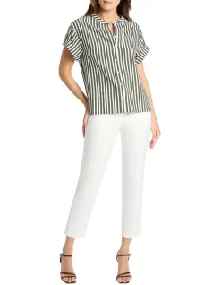 Relaxed through the body, this short sleeve blouse pairs an effortless, boxy fit with a bold vertical stripe in shades of moss green and crisp white. Flattering within its collarless crew neckline, the blouse draws the eye further with angled sleeves with rolled cuffs secured by a button-tab, broad straight shaping at the hem, and a front button closure that fastens with contrast white buttons.