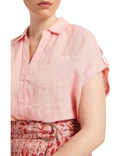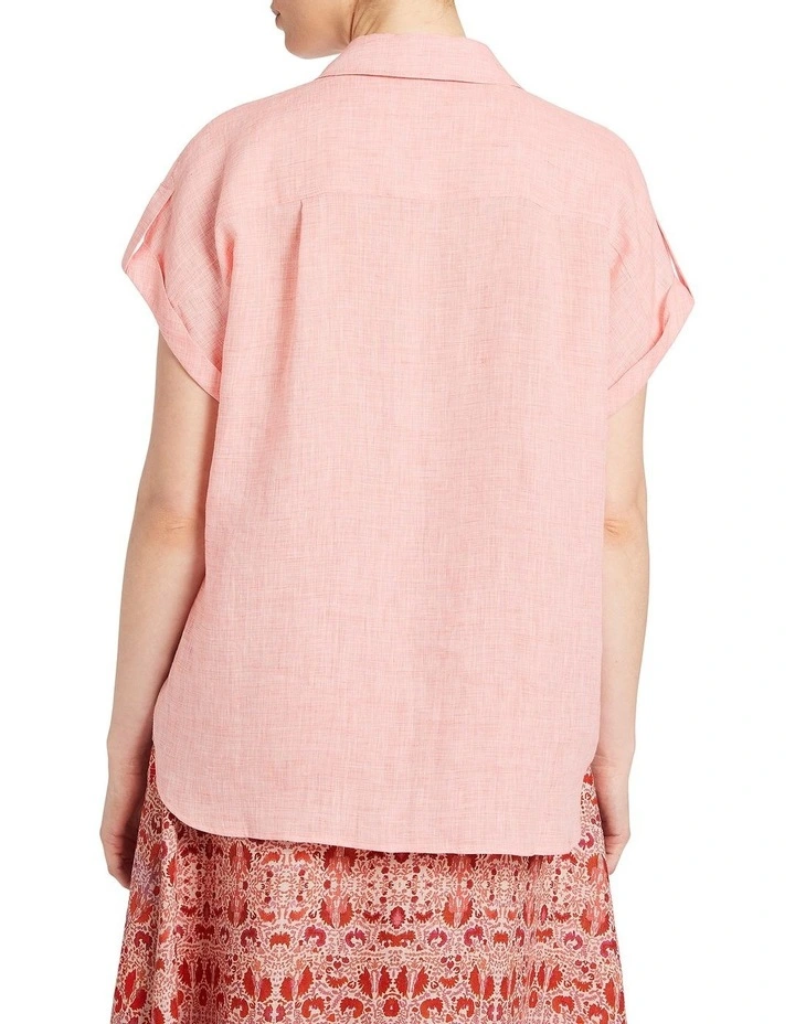 Creating an effortless summer look that will pair back easily within your wardrobe, this linen shirt feels soft, lightweight and breathable, offered in a pale peach hue. Creating a relaxed fit with grown-on short sleeves and curved shaping at the hem, the shirt continues to appeal with patch pockets at the chest, and contrast pearlescent buttons at the front fastening and shoulder tabs.