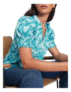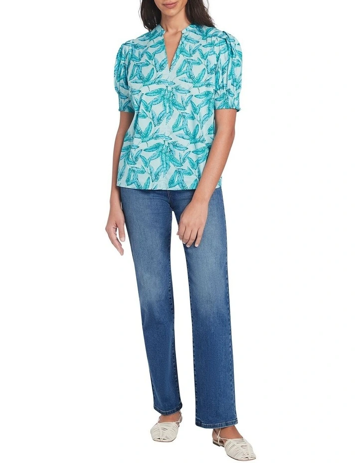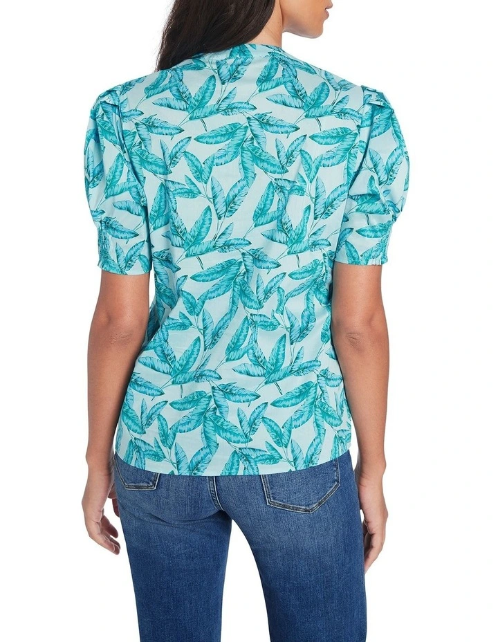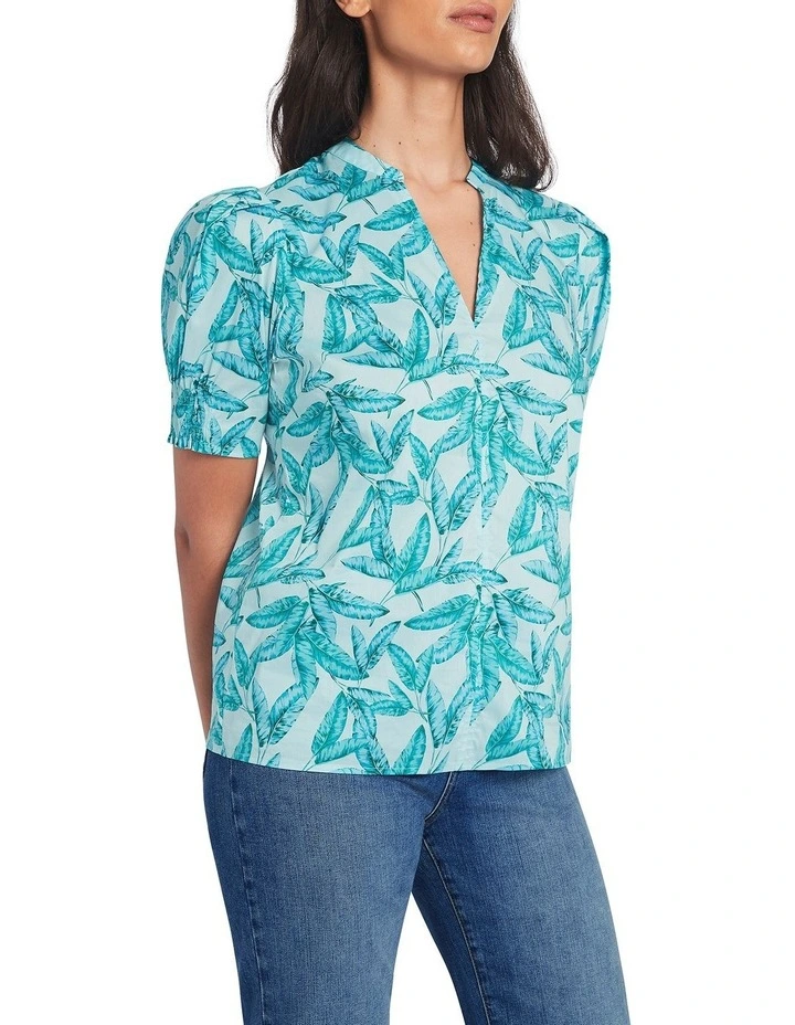 Flaunting vibrant aquamarine within an exclusive leaf print, this blouse feels flowy and lightweight, made from a soft cotton blend. Relaxed through the body, the blouse also features voluminous shaping at the short puff sleeves, completed by elasticated cuffs, an open V-neckline and centre-seam stitch detailing at the front.