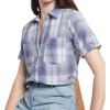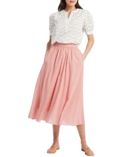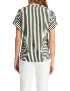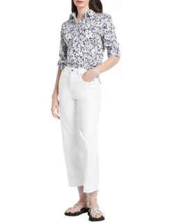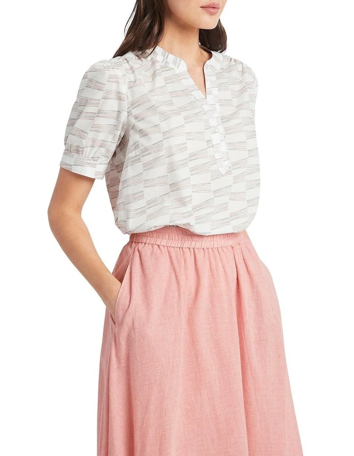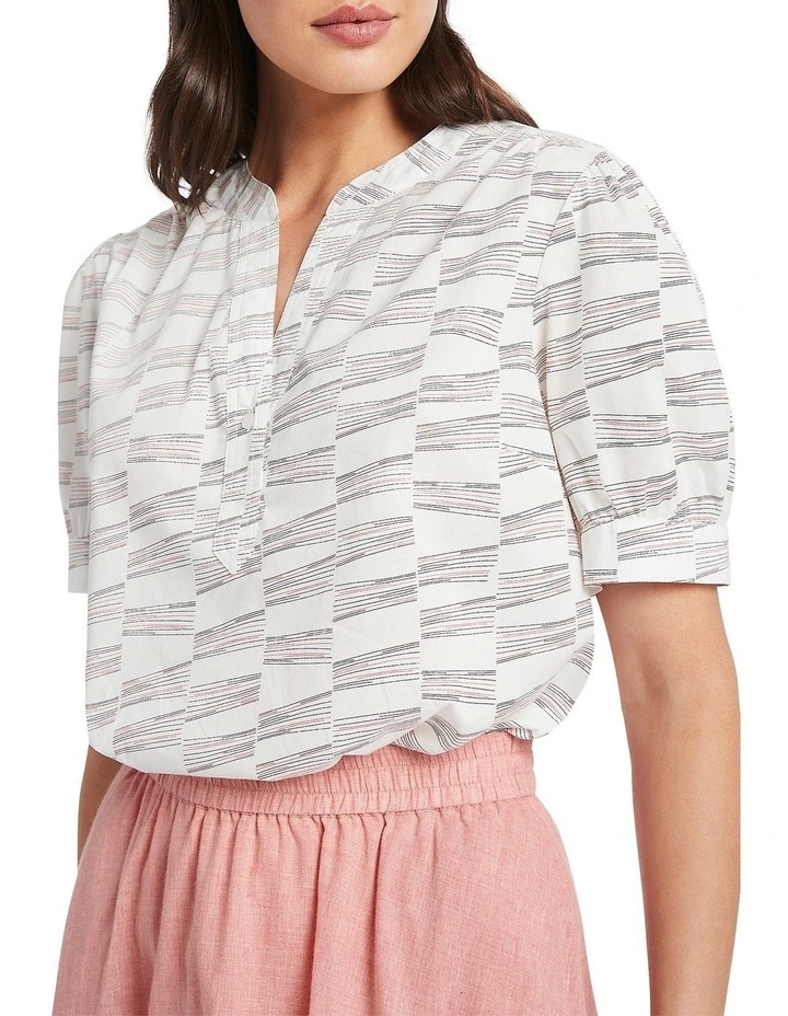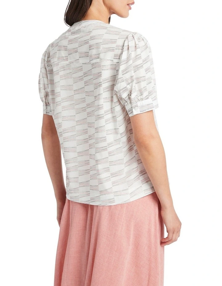 Effortlessly soft against the skin, this short sleeve blouse is made from lightweight cotton voile, revealing a muted all-over print against a white base. Offering a relaxed, boxy fit, the blouse fastens at the front of the open V-neckline with a single button, while showing off further detail in its soft stand collar and puff shaping through the shoulders.