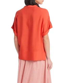 Made from gorgeously soft modal, this lightweight blouse creates a boxy fit with dropped shoulder shaping and relaxed short sleeves. Vibrant in its orange in colouring, the blouse fastens at the front with complementary orange buttons, and is completed by a collarless crew neckline, and a button-tab feature at the outer arm that secures its rolled cuffs in place.