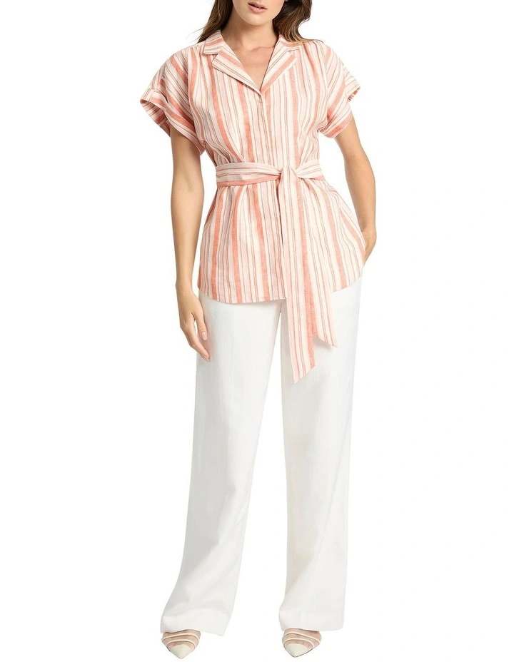 Showing off a vertical stripe in pale shades of pink and tangerine, this striped shirt feels perfect for summer as it skims lightly over the skin in pure, breathable linen. Featuring grown-on short sleeves within a relaxed silhouette, the shirt creates definition at the waist with a fabric self-tie belt, with further detail found in a relaxed resort collar and secured rolled sleeve cuffs.