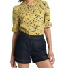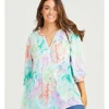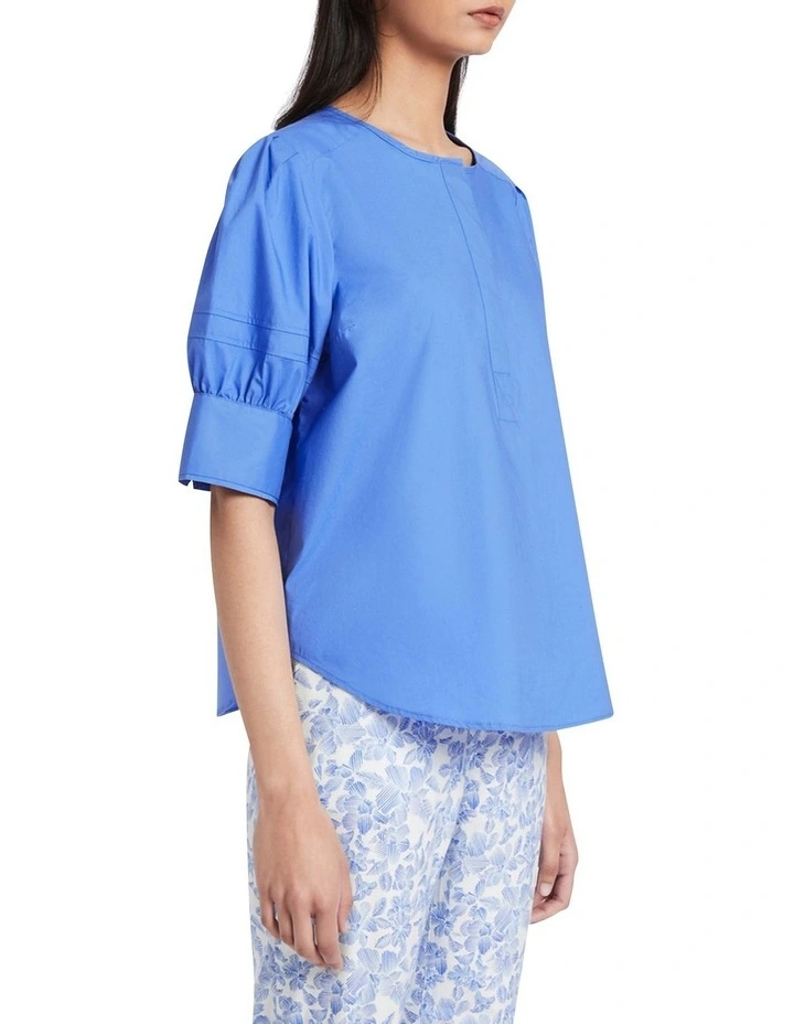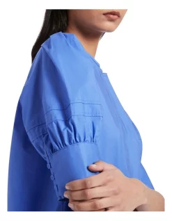 Voluminous in style, this captivating blouse feels soft and lightweight in pure cotton, creating a full, relaxed fit complete with short balloon sleeves. Revealing a gorgeous shade of bluebell, the blouse features a neat round neckline with a concealed button closure to mid-chest, with further detail found in stitching at the sleeves, fabric button cuffs, and curved shaping at the hem.