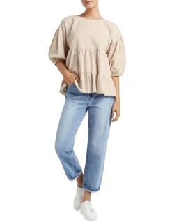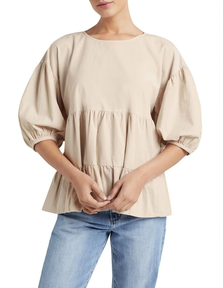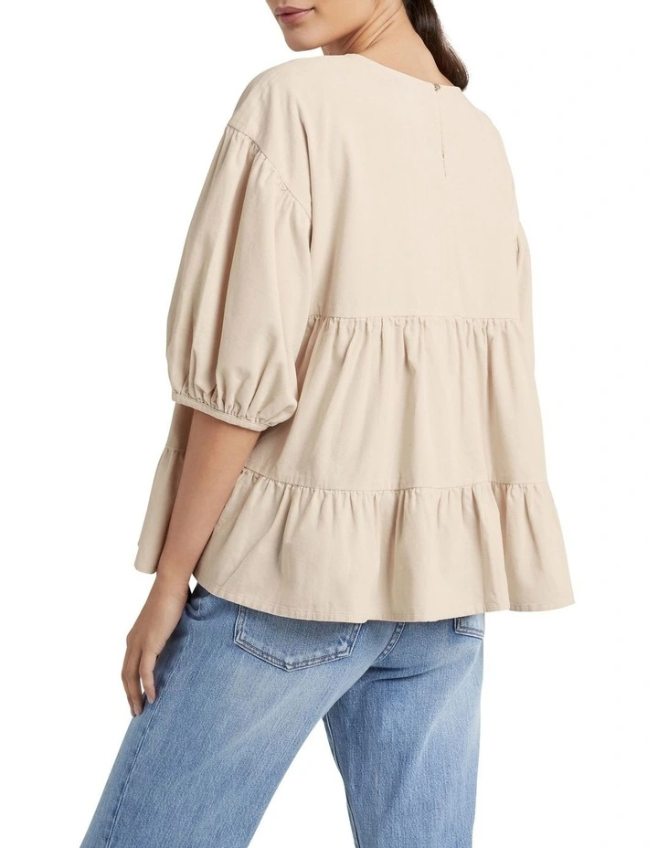 The Cord Tiered Top is the perfect style to wear across the seasons. It features a lighterweight, fine cord fabric in an oversized loose fit, with a curved neckline, straight hemline, on-trend tiered design and comfortable loose sleeves. Wear with jeans and sneakers or boots. Our model wears size AU 8/XS. She usually wears a standard AU 8/Extra Small, is 179cm tall, and has a 83cm bust, 96cm hips and 63cm waist.