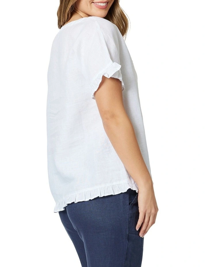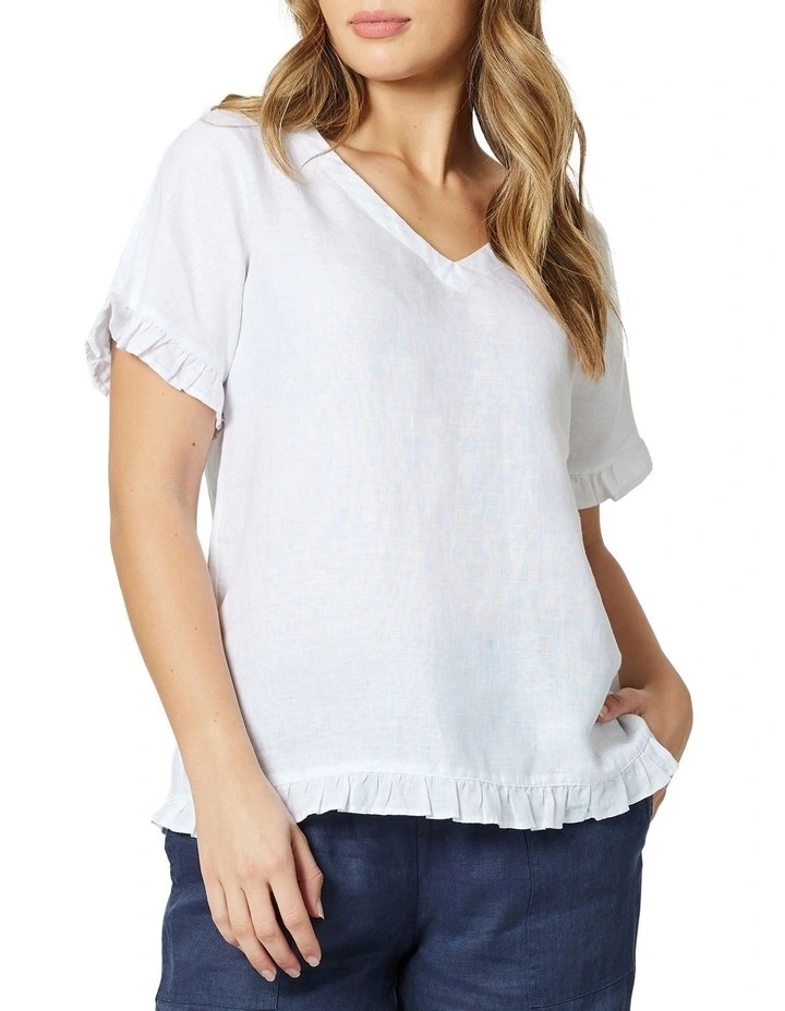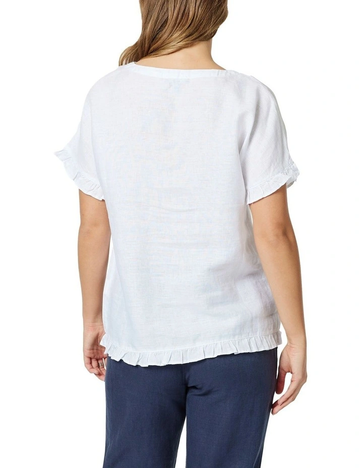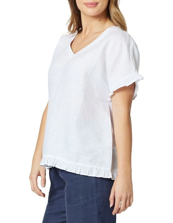 The must have top of the season is the new Alex Ruffle Linen Top by Gordon Smith. Styled in their signature washer finish pure linen. This classic fitting top is an easy pop over the head style, with a flattering V-neckline, an extended shoulder line and short sleeves. With the added styling detail of the pretty frill trim detail on the hemlines. Perfect paired back with one the new season Linen pants, shorts or skirt. This top is sure to be on high rotation in your wardrobe. Style that fits the way you live.