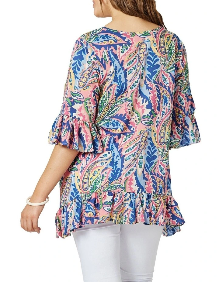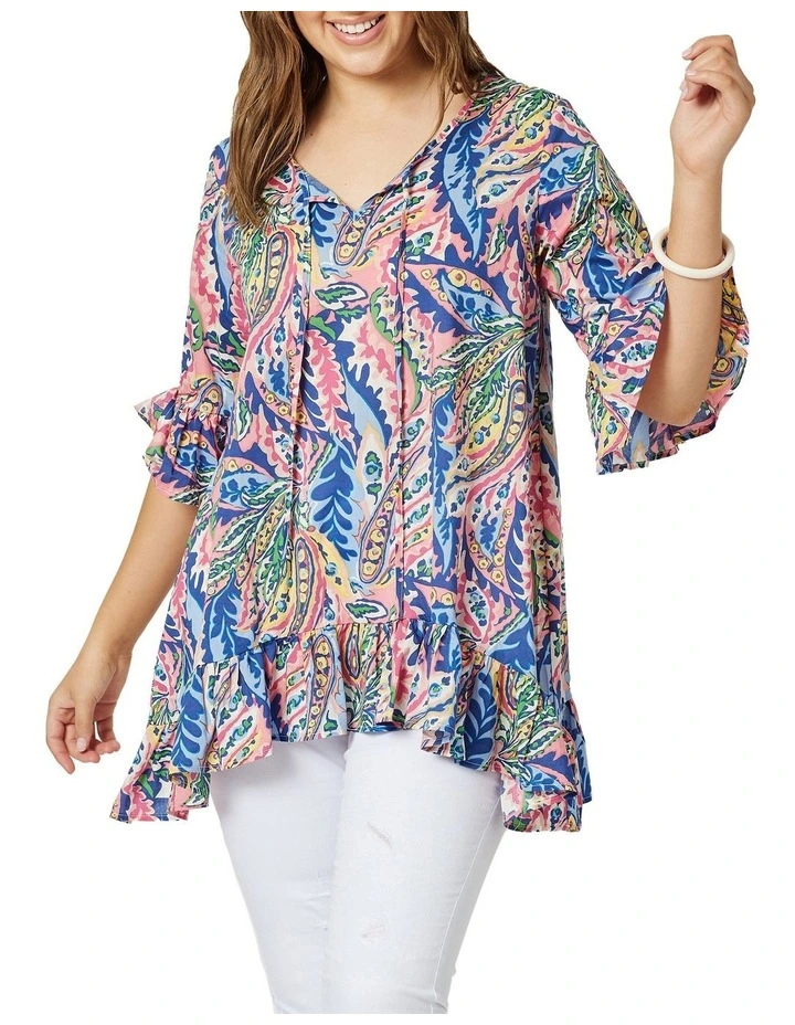 An easy fitting A-line tunic style top, rounded neckline with front split and self ties with contrast tassles. The top features elbow length sleeves with gathered hem panel, a subtle high low hemline with pretty gathered hem panel.