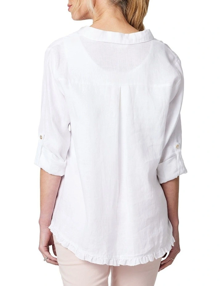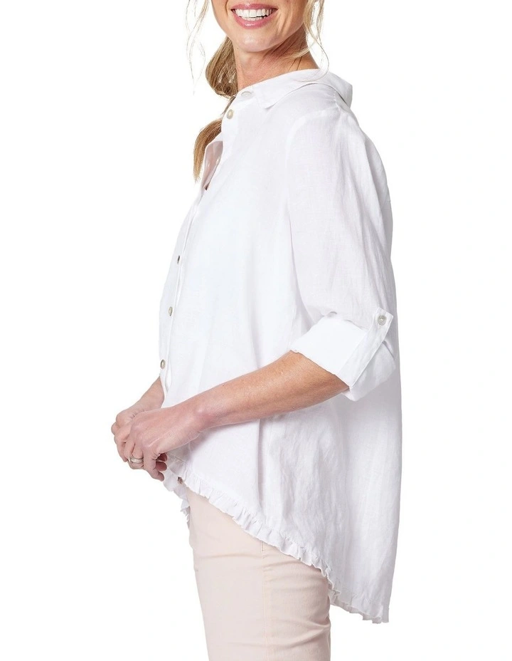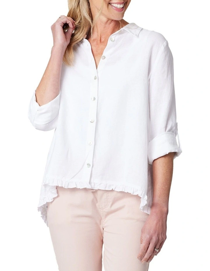 The Ruffle Hem Linen Shirt by Gordon Smith is the new must have piece for the season. Styled in their signature washer finish pure linen. This updated classic shirt features a button through front opening with pretty shell buttons and a collar. Versatile long sleeves with cuffs that can be worn long or tabbed up. A flattering subtle high low hemline with a narrow frill hem finish.