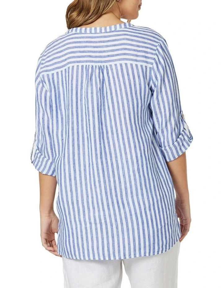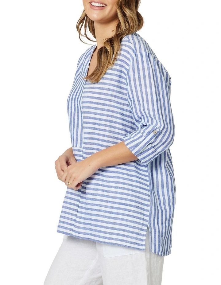 The stunning Stripe Tab Sleeve V Neck Top by Hammock & Vine is a nod to the nautical trend this season. Styled in their signature pure linen, a modern yarn dyed stripe with washer finish.
