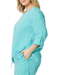 The Tab Sleeve Drawstring Hem Linen Top by Hammock & Vine is a must have update for this season. Styled in their signature quality washer finish linen. An easy fitting pop over the head tunic style top that features a flattering rounded neckline, extended shoulder line with long sleeves that feature versatile tab up button detailing.