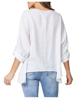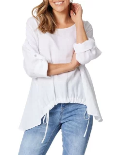 The Tab Sleeve Drawstring Hem Linen Top by Hammock & Vine is a must have update for this season. Styled in their signature quality washer finish linen. An easy fitting pop over the head tunic style top that features a flattering rounded neckline, extended shoulder line with long sleeves that feature versatile tab up button detailing. With a stunning asymetric angled hem line with self adjustable ties, you can wear this top more a-line or gather in for a unique look. Perfect paired back with linen, denim or the new Jersey Rib Waist pant. Fashion that never goes out of style.