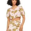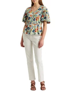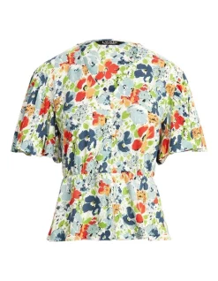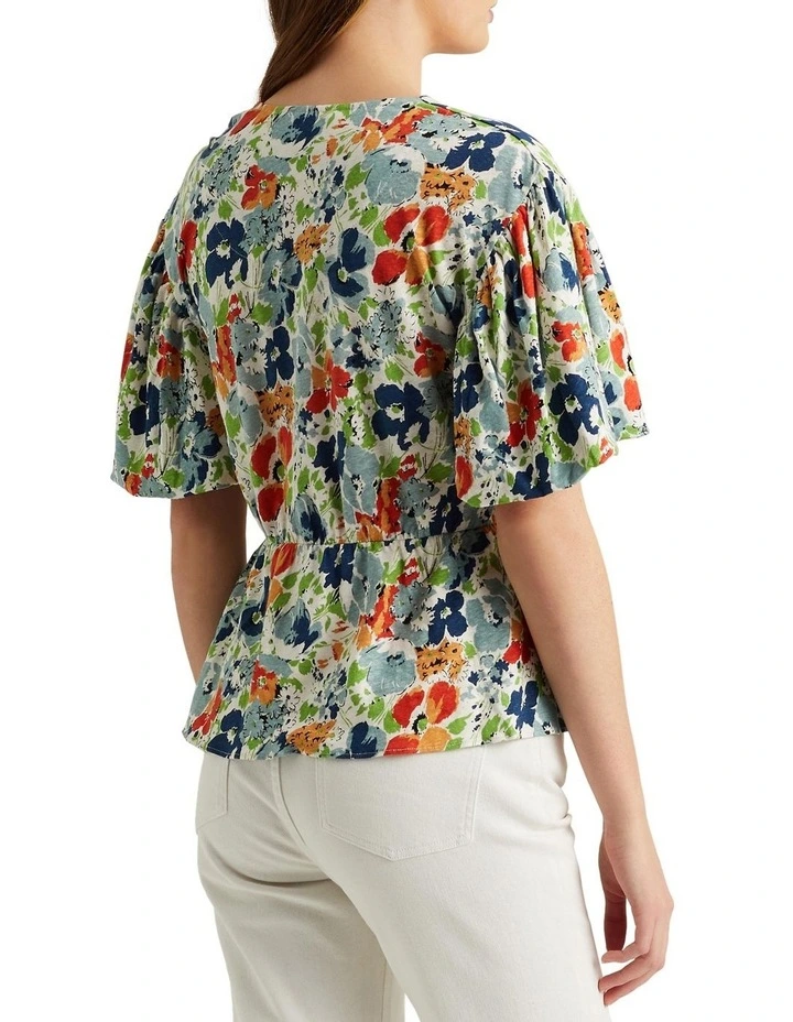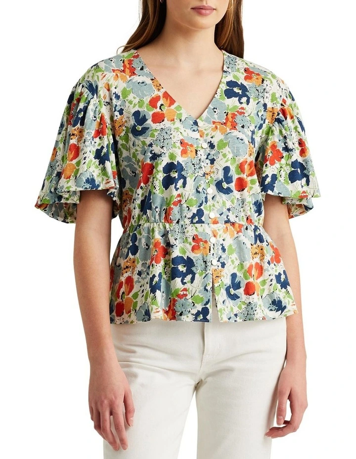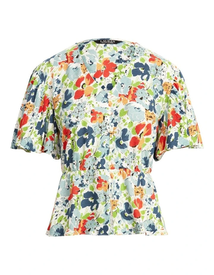 This top’s feminine spirit is amplified by a peplum silhouette, billowing bubble sleeves, and a V-neck, while Lauren’s engraved buttons nod to signature style. A lightweight linen jersey fabrication makes it a must-have for the warmer months.