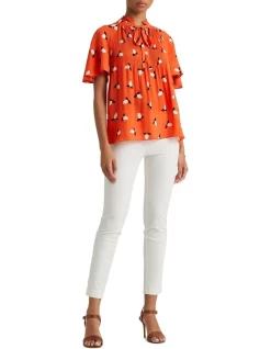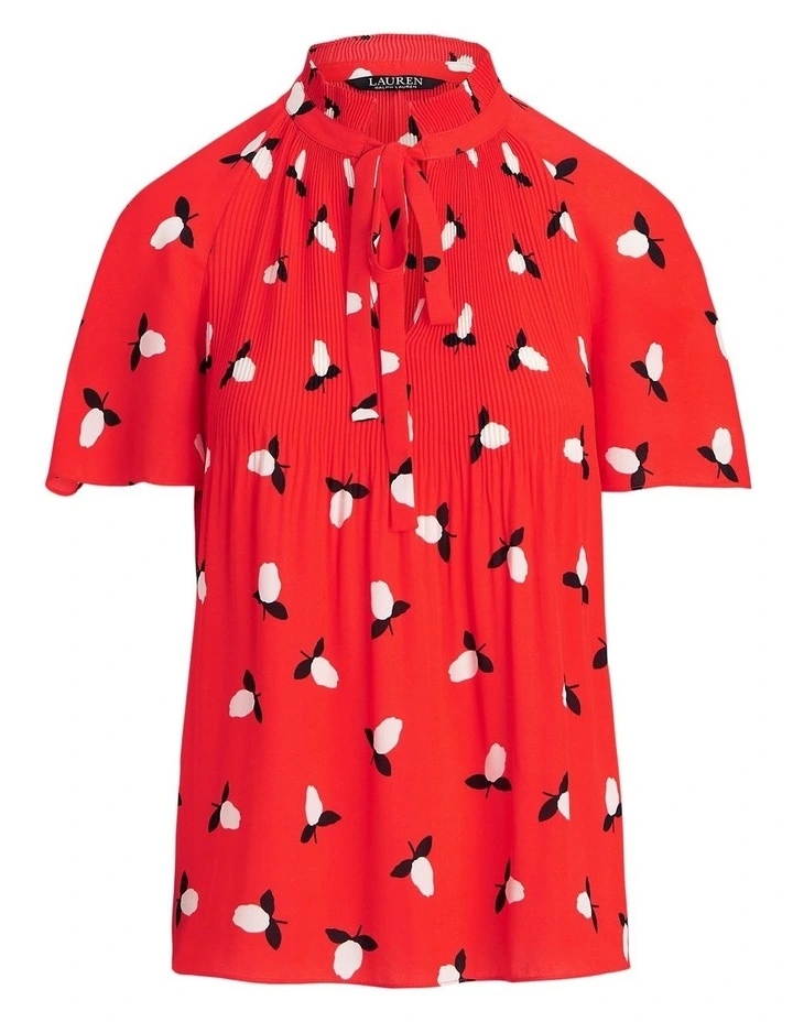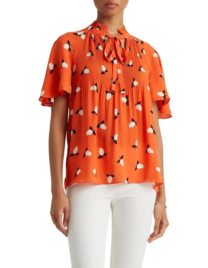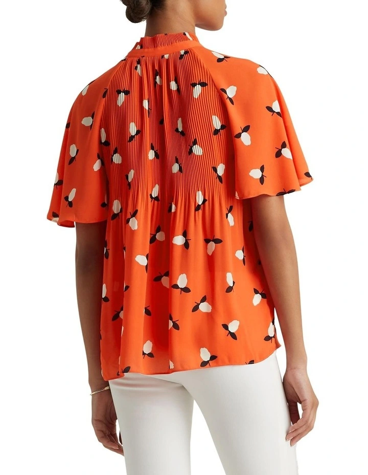 Elegant flutter sleeves are complemented by delicate sunray pleating and self-ties at the neck to create this sophisticated blouse, which is cut from airy georgette printed with the season’s floral motif.