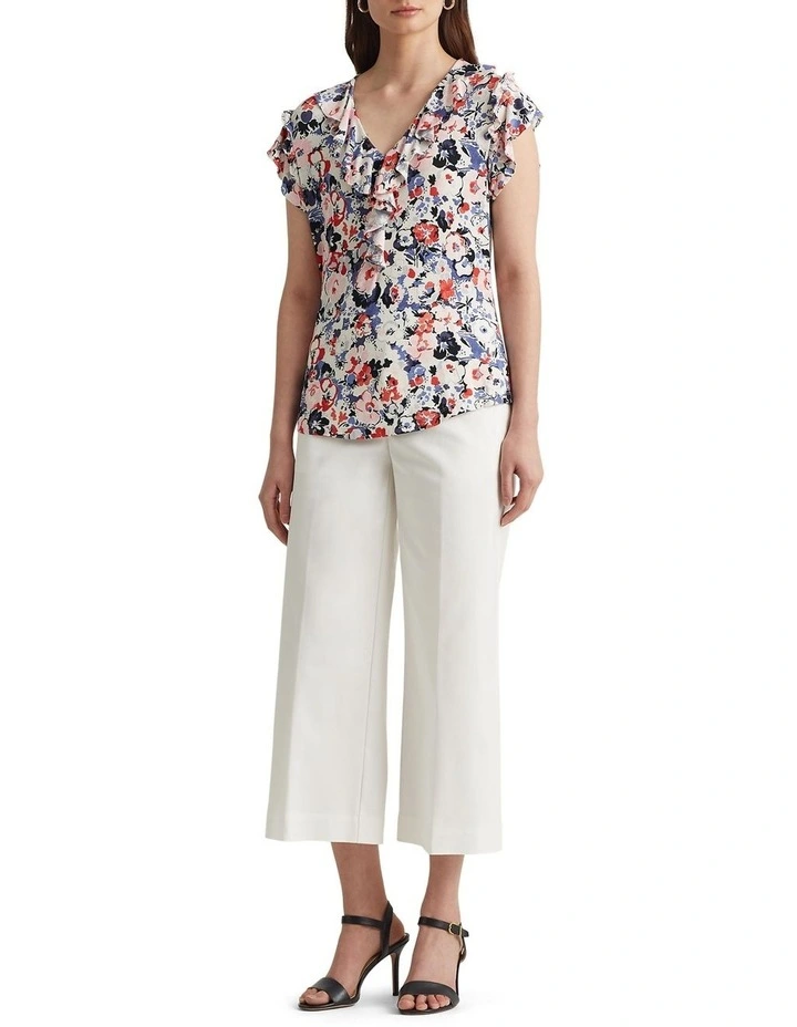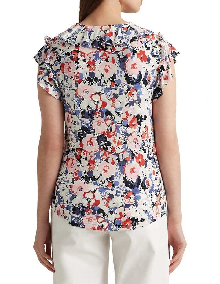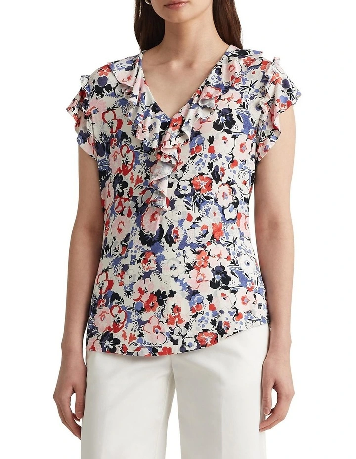 Cut from fluid jersey for an effortless drape, this floral top is distinguished by flutter sleeves and a ruffle-trim V-neck.