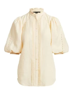 Crafted from breezy linen, this romantic blouse expertly marries an ultrafeminine ruffle-trimmed collar and puffed sleeves with a menswear-inspired buttoned placket. Lace insets and “Lauren Ralph Lauren”engraved buttons provide a refined finish.