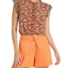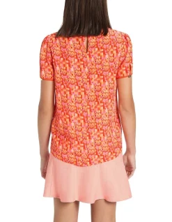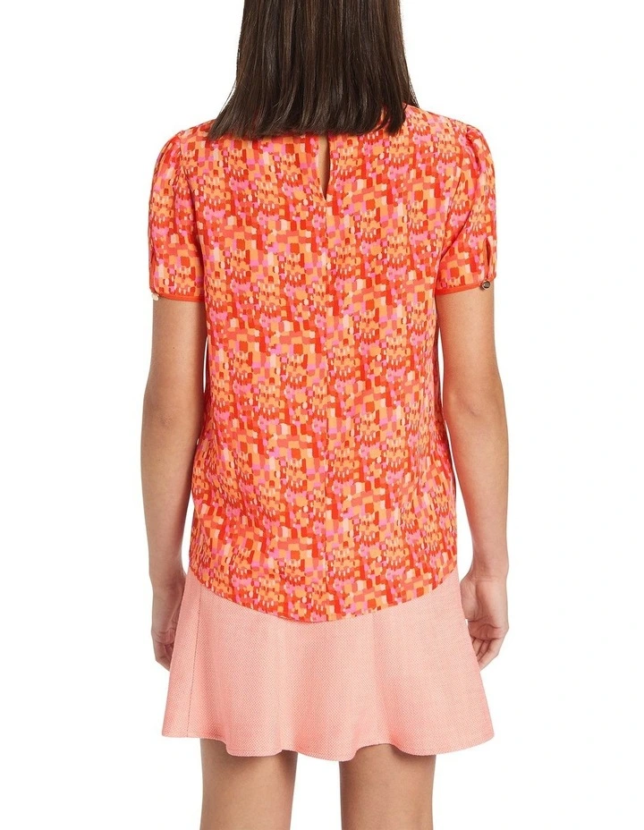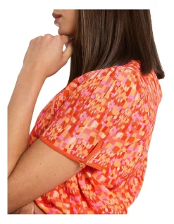Flaunting all the shades of summer, this short sleeve top displays a riot of paw paw, pink and mango within its beautiful, bold print, perfectly accentuated by orange trim details at the neckline and cuff. Flowing through lightweight, relaxed shaping, the top continues its appeal with pleats at the front of the neck, and gold button detailing at the back of the neck and cuff.
