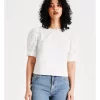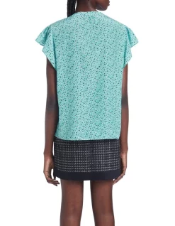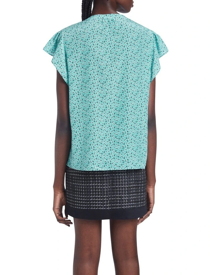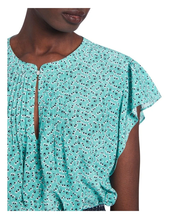 Flaunting an intricate print within a rich turquoise blue, this top flows beautifully through soft silk, creating a loose, relaxed fit with short flutter sleeves and curved shaping at the hem. Featuring a flat collared neckline, the top fastens at the front of the neck with a delicate silver button above a deep keyhole opening, accentuated with tuck detailing at either side.