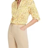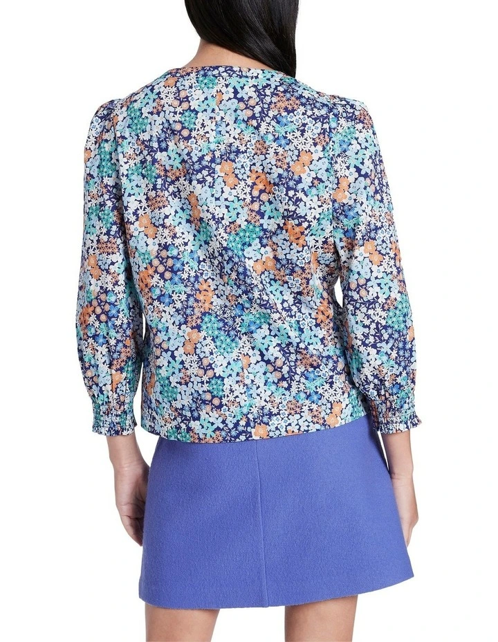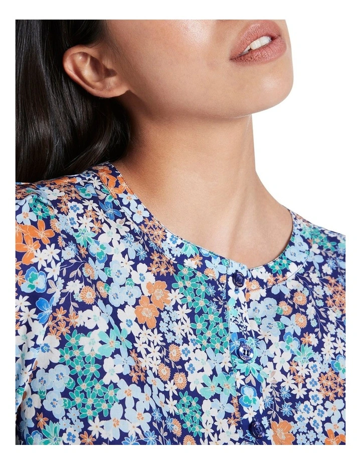 Lightweight and super soft, this shirt flows through a loose, relaxed fit, revealing a colourful, blue-based floral print within pure cotton voile. Featuring volume through the three-quarter length blouson sleeves, the shirt is completed by shirring detailing at the cuffs, and a button front closure to the chest, below a neat crew neckline.