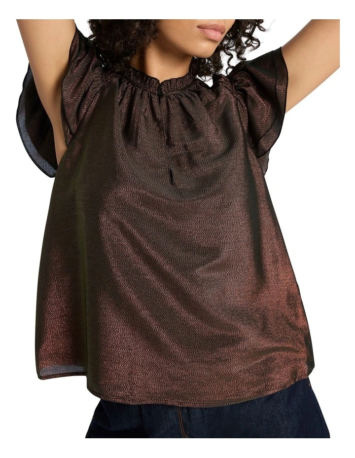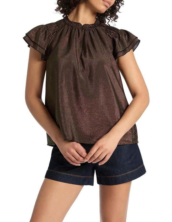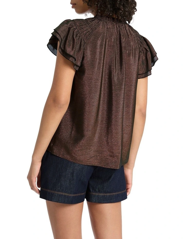 Entirely appealing, this gorgeous top creates a loose, lightweight look accentuated by a muted metallic finish that shifts effortlessly between shades of deep red and black. Accentuated by lightweight layering through its short sleeves, the top creates further interest with gathered shoulder panel detailing and a delicate button closure at the front of the high ruffled neckline.