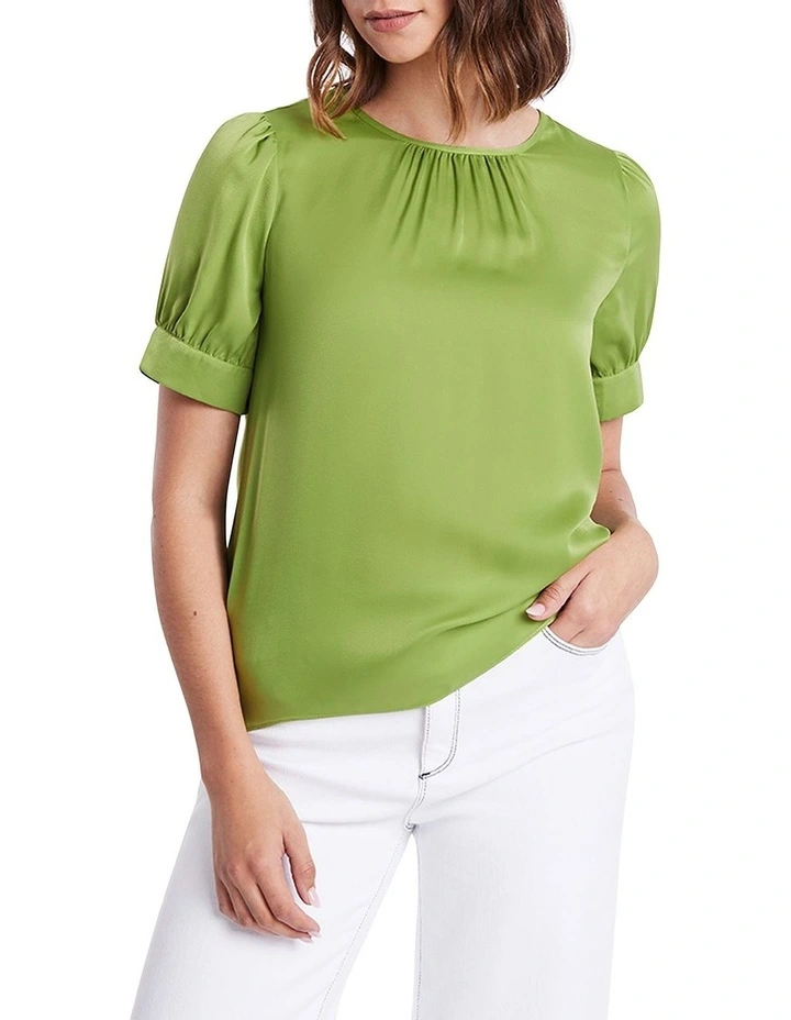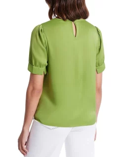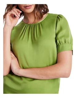 Skimming over the skin, this top reveals a rich, glossy guacamole green, made from a soft, silky blend containing recycled polyester. Fastening at the back of the neck with a keyhole button closure, the top delivers effortless, regular shaping through the body, finished with gather detailing at the round neckline and short, shaped sleeves with split feature cuffs.