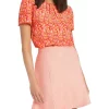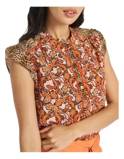 Skimming over the skin in pure silk, this top turns heads as it flaunts a vibrant mix of paisley and animal print, perfectly accentuated by contrast orange piping and pale pink buttons. Fastening at the front to create a slim fit with curved shaping through the hem, the top is further enhanced by a neat collarless neckline and soft ruffle detailing at the cap sleeve.