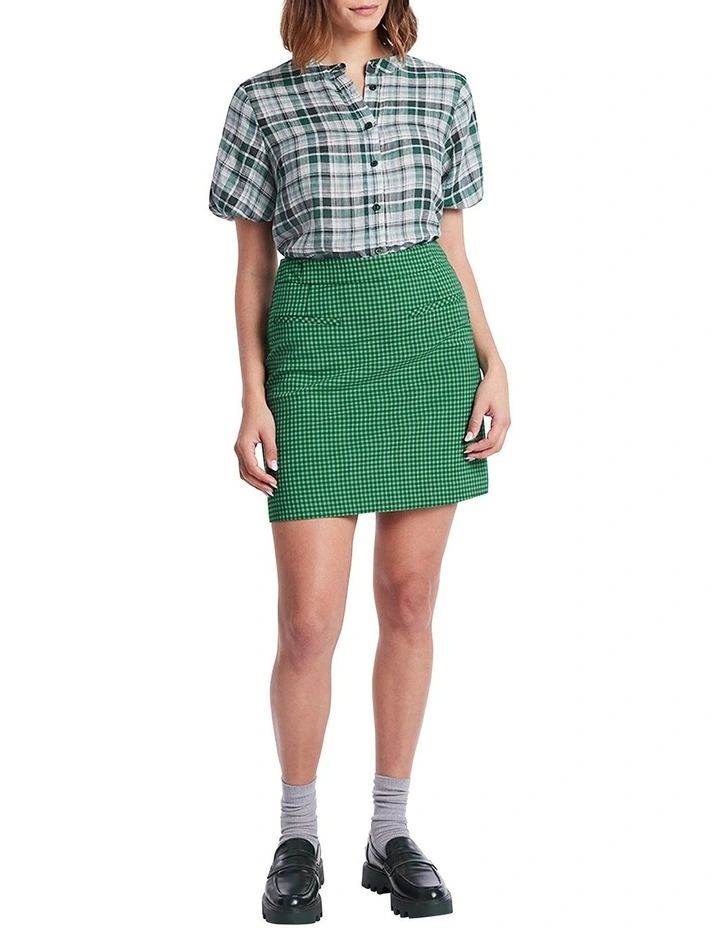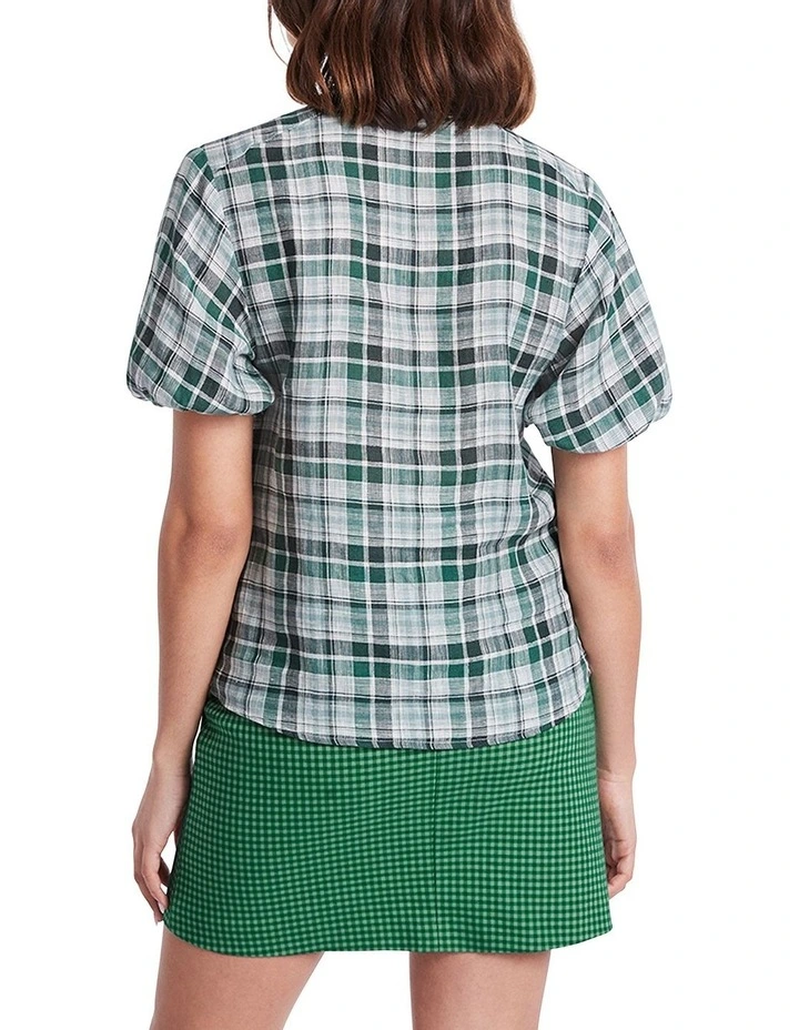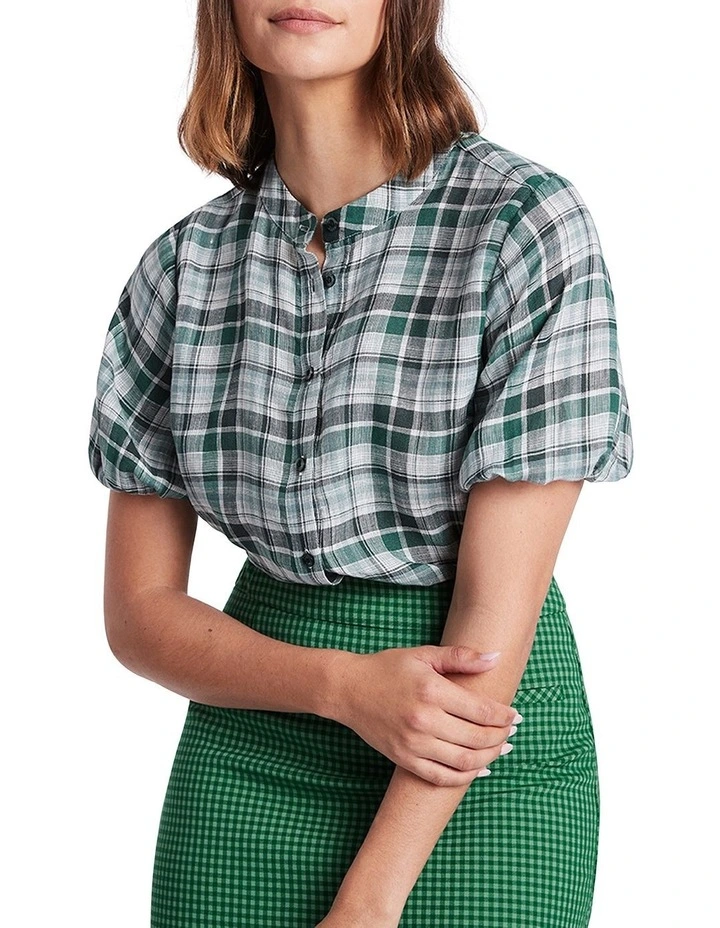 Revealing muted green tones accented with silver, this shirt shows off a European check set on pure, lightweight linen. Offering a regular fit as it fastens at the front with a classic button closure, the shirt creates further interest with its flat collarless neckline, curved shaping at the hem, and short puff sleeves gathered in with elasticated cuffs.