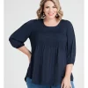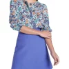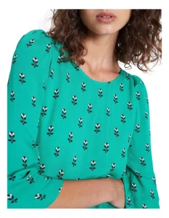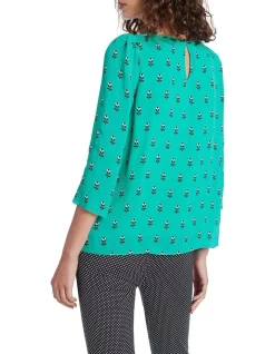 Fully lined through the body, this top creates a flowing, lightweight look, complete with fullness through the hem and gathered detailing at the shoulders. Revealing a beautiful Maldive blue with a geometric floral print, the top flatters with an open round neckline and three-quarter length sleeves, with further detail offered in its keyhole button closure at the back of the neck.