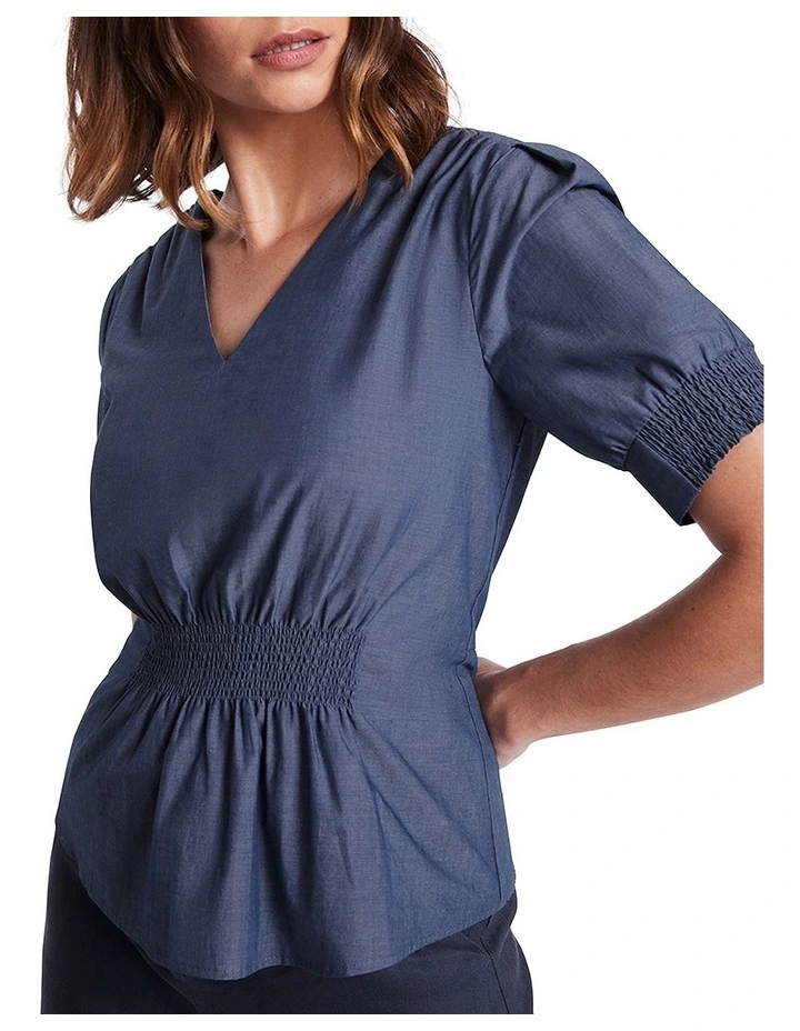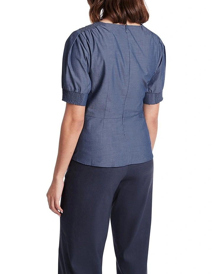 Creating a slim fit that curves close through the body, this short sleeve top flaunts a beautiful chambray denim look, made from pure cotton. Lined with cotton to provide additional comfort, the top continues its appeal with elasticated gathers at the shoulder, cuff and front of the waist, finished with a concealed zip closure at centre-back.