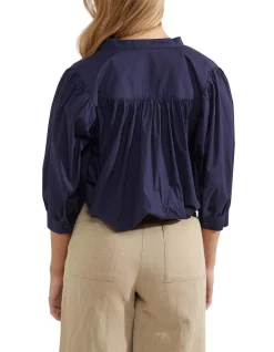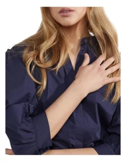 A graceful and versatile style, the Iris Cotton Poplin Blouse will take you from work to play. This shirt is designed for a relaxed fit with an elegant pleated design. It is crafted from 100% cotton with a poplin finish and features three-quarter length ballooned sleeves, wide cuffs, a round neckline, and concealed button placket. Complete an effortless summer look with some wide-leg pants and sandals.
