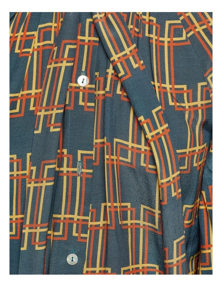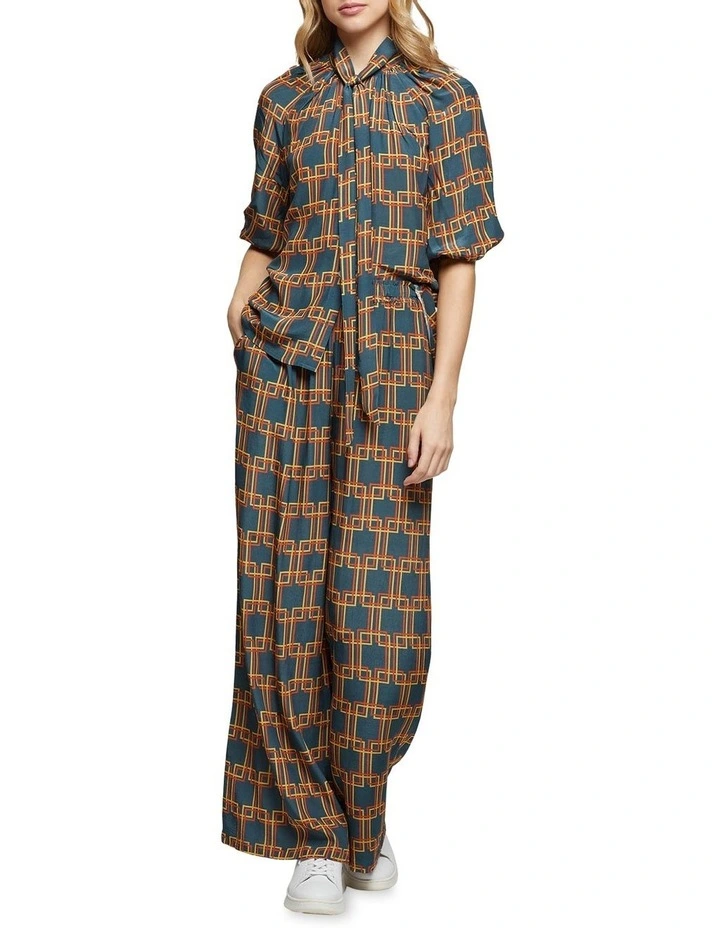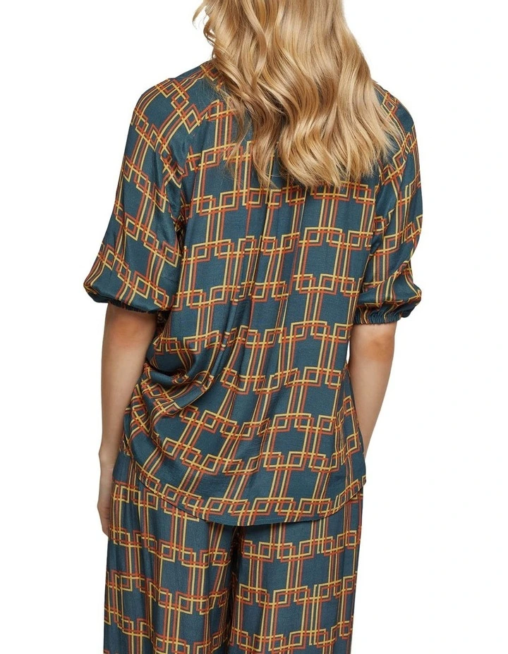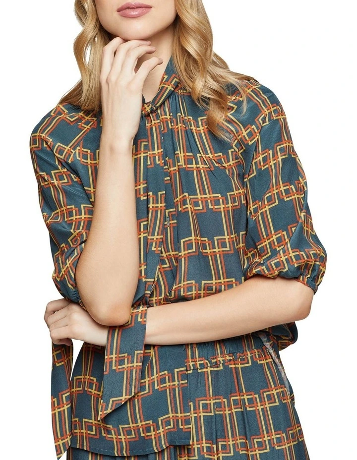 A graceful look for any occasion, the Simone Geo Printed Top is a timeless look. This light and flowy top has a chic geometric print and features a long neck tie, mid-length sleeves and high neckline. Team it with the matching Chantel Drawstring Wide Leg Geo Print Pants and sneakers to complete the look.
