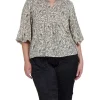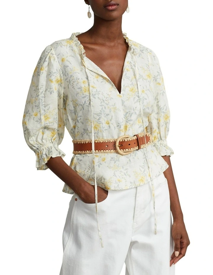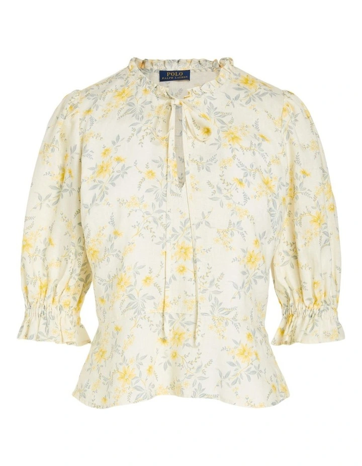 - Ruffled trim at the rounded neckline. Center front keyhole secures with self-ties.