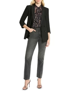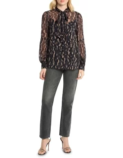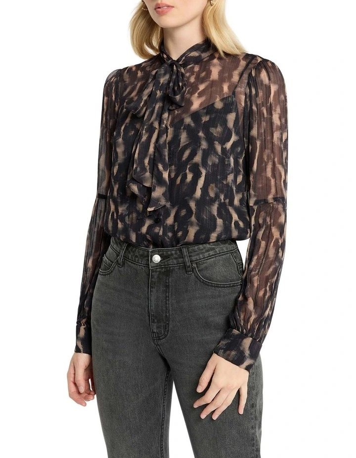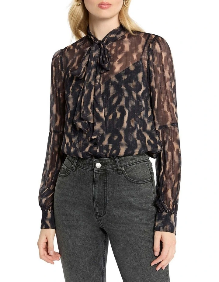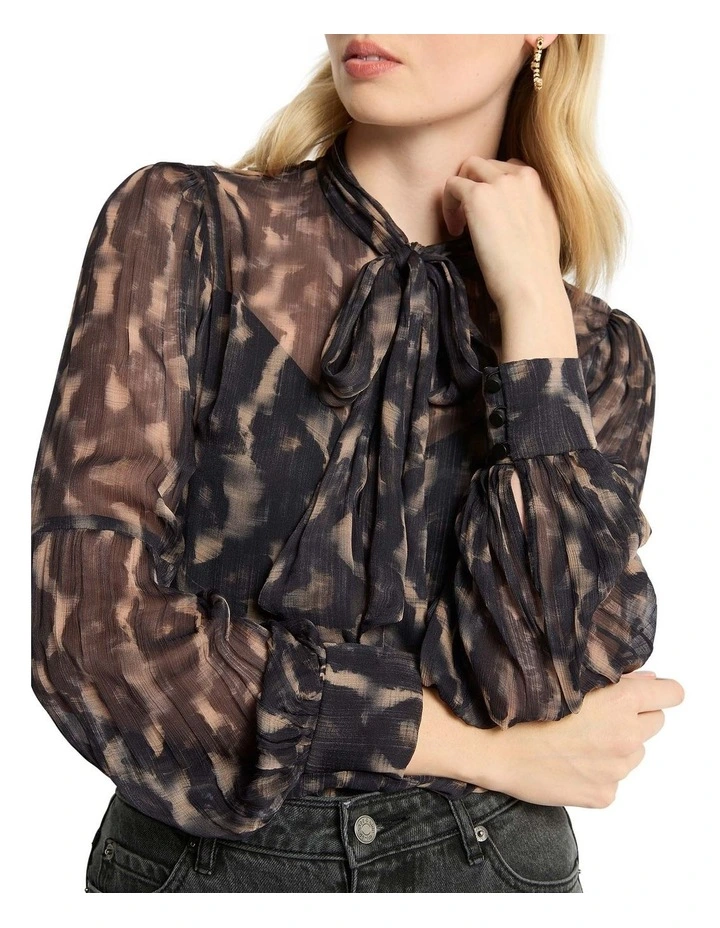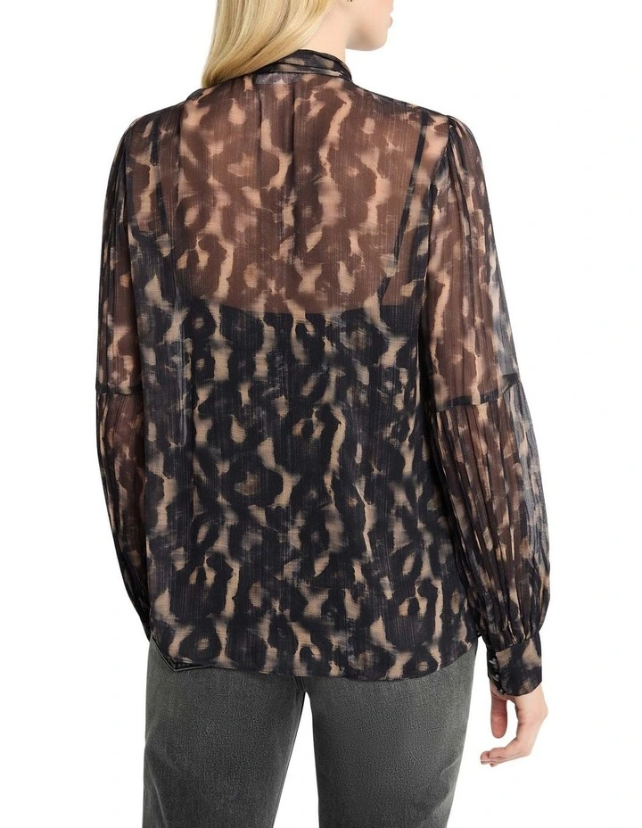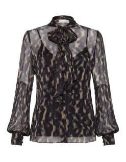 Flowing through a lightweight, relaxed fit, this sheer blouse flaunts dark, muted tones within an abstract animal print, accentuated by a black cami lining. Featuring long sleeves with balloon shaping from elbow to cuff, the blouse continues its appeal with a button front fastening below an open V-neckline, where a draped tie can be worn loose or secured at the neck with a pussybow.