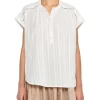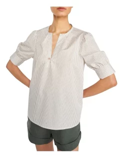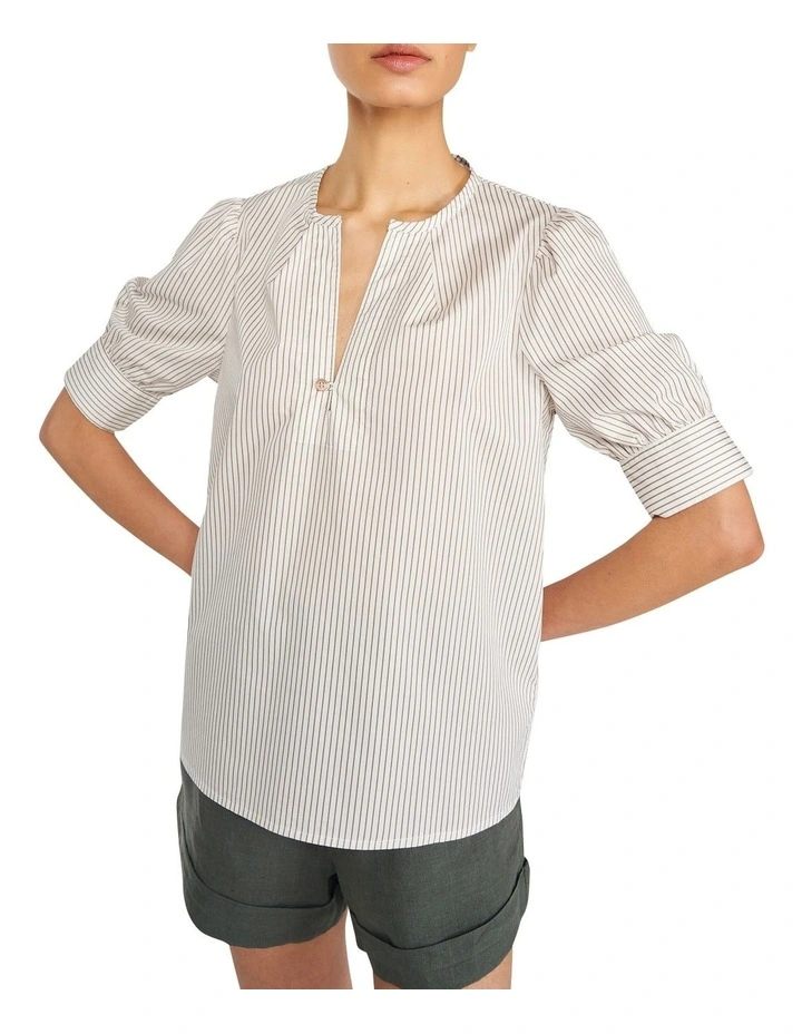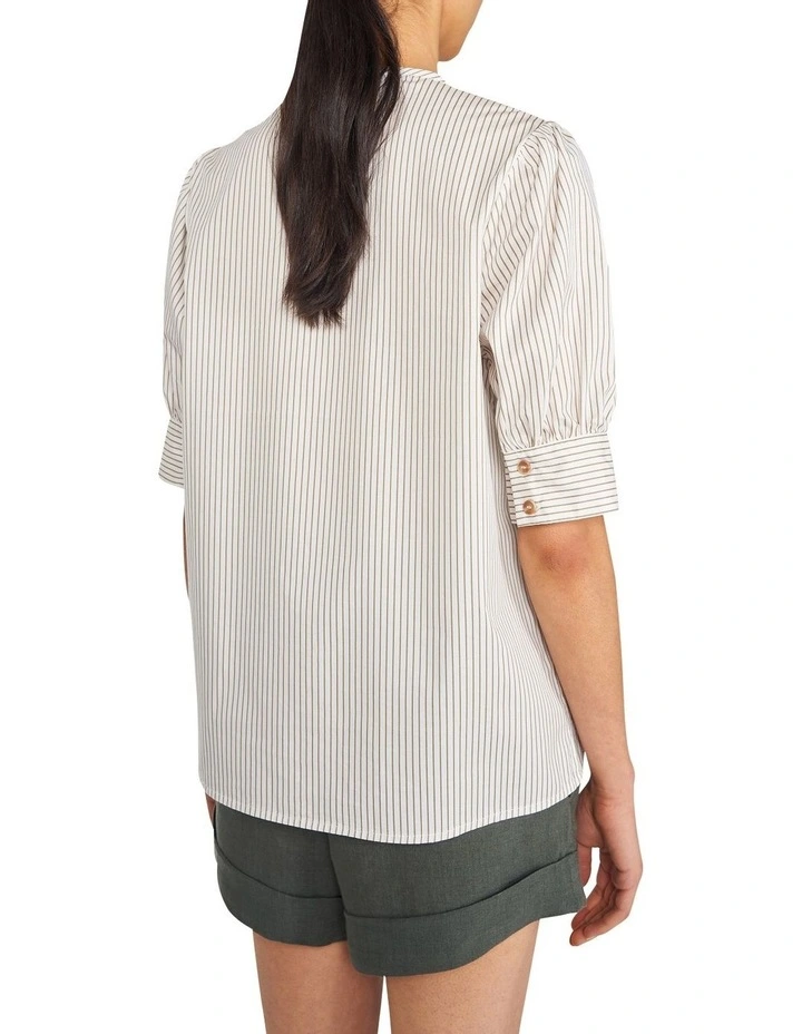 Our new Cotton Stripe Blouse is featured in a lustrous cotton poplin and highlighted with a soft mustard stripe. Completed with a short sleeve for the warmer months and an open v neckline with button closure for versatility.Β