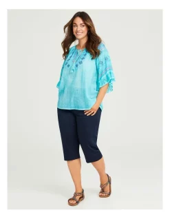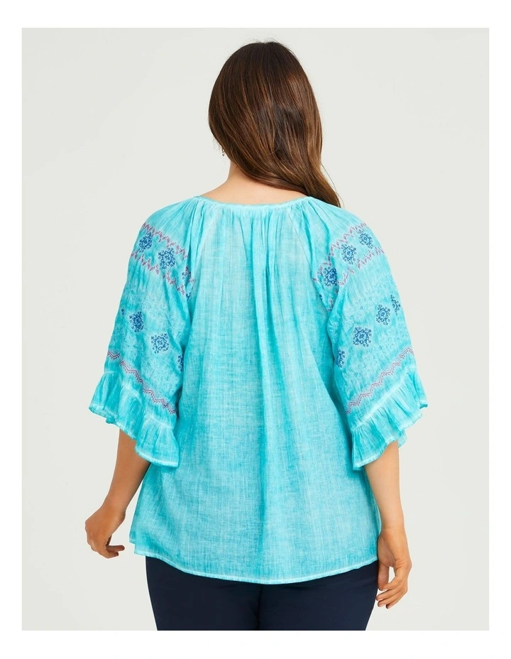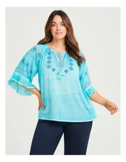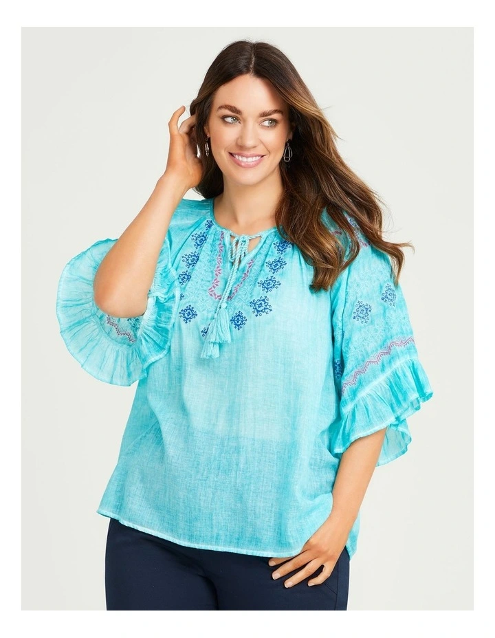 With its breezy capri blue, you get boho stylishness with the Cotton Pigment Print Top. Made of 100% cotton to promote breathability, this pigment wash top with an embroidery detail is the best of relaxed summer dressing. This top has a 3/4 bell sleeve and tie front with tassel trim and will fall flatteringly over your jeans, crop pants, even culottes. Measures: 69cm long from centre back neck to hemline on a size 14.