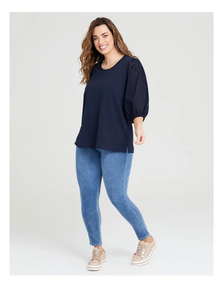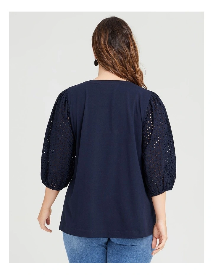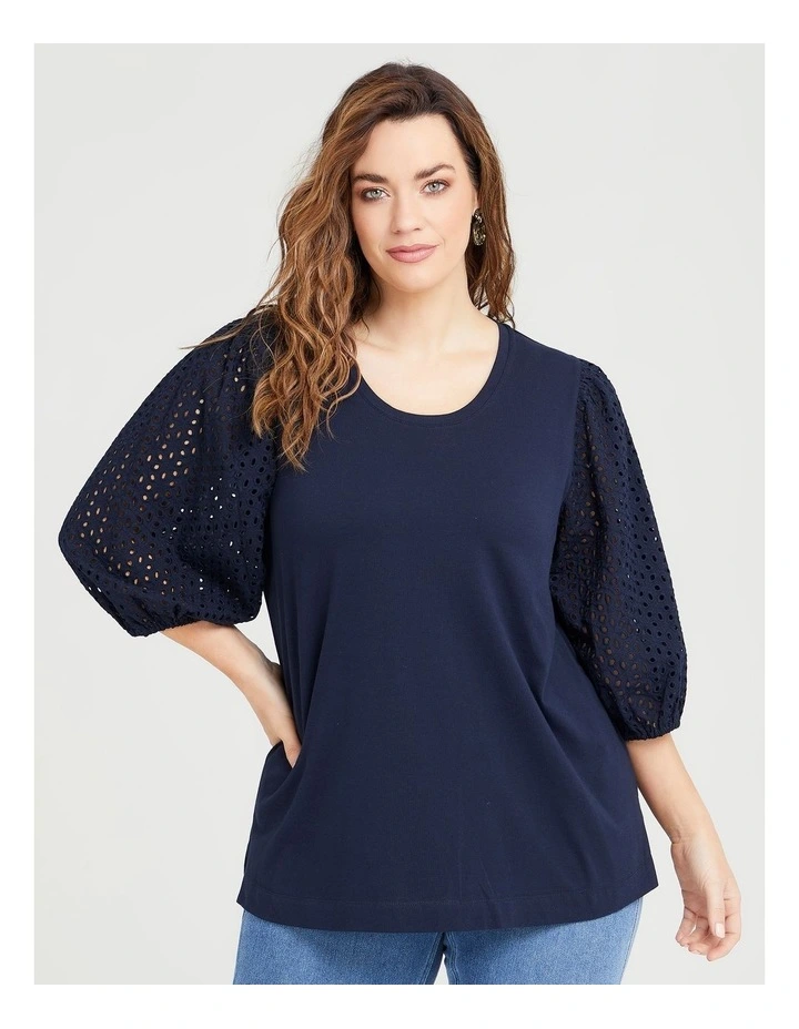 Update your wardrobe and create new looks with the Organic Broderie 3/4 Sleeve Top. Crafted from an organic cotton blend, this curve-flattering top is extremely lightweight and has excellent breathability, while the 100% cotton sleeves boast a beautifully detailed broderie finish and add an element of uniqueness and detail. Featuring a flattering, curved hemline, round neck and soft elastic at sleeve cuffs. As comfortable as it is versatile, this plus-size top is a great addition to your wardrobe this season, paired with jeans for casual weekend style, or dressed up for an elevated evening look!