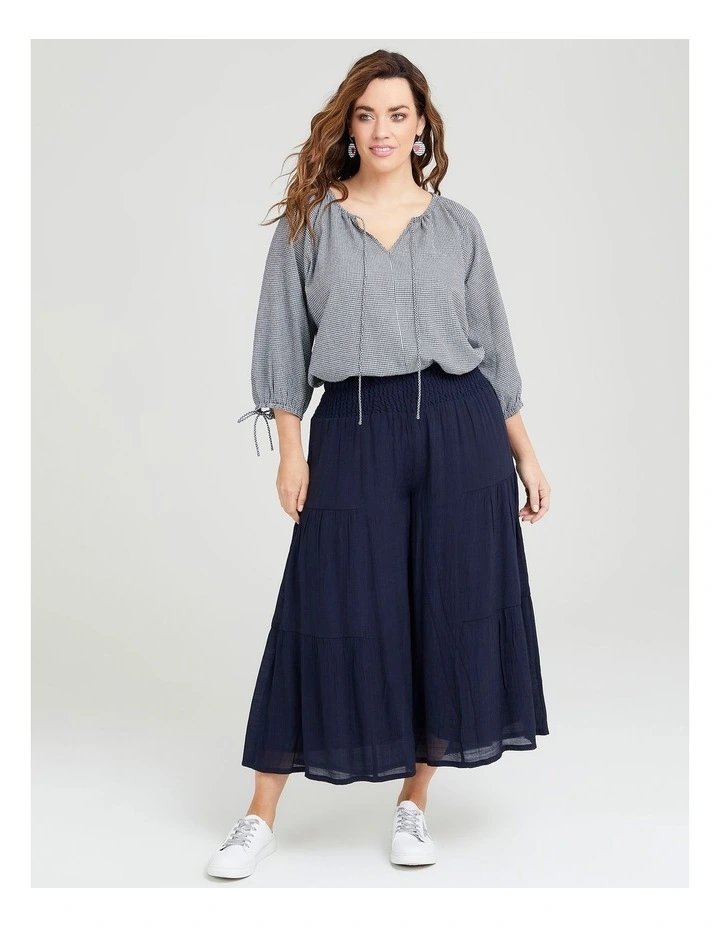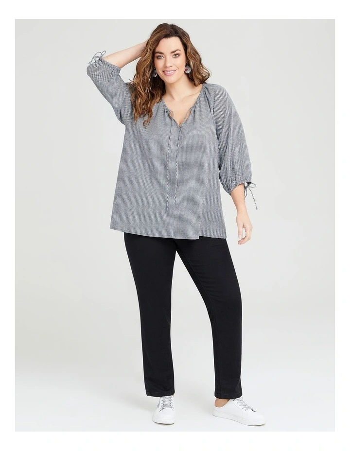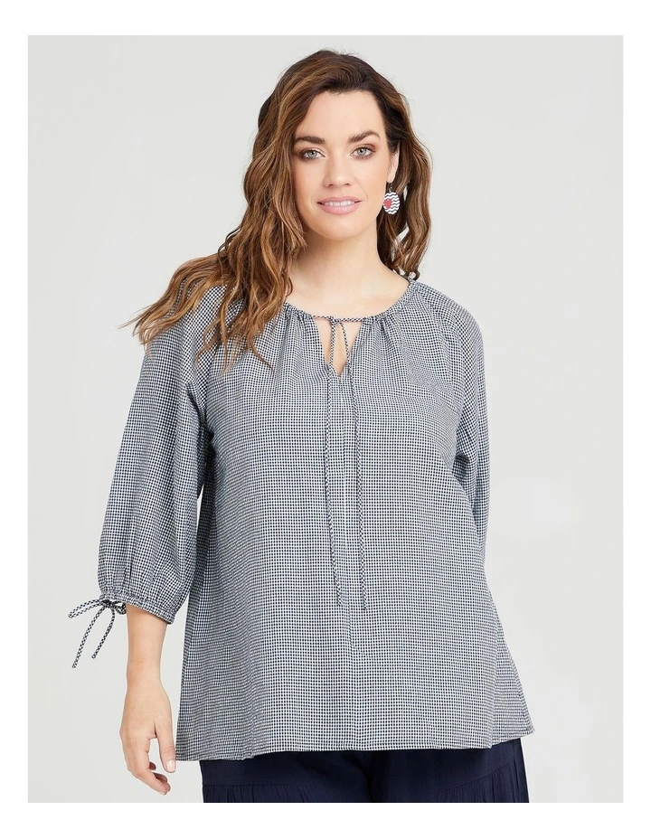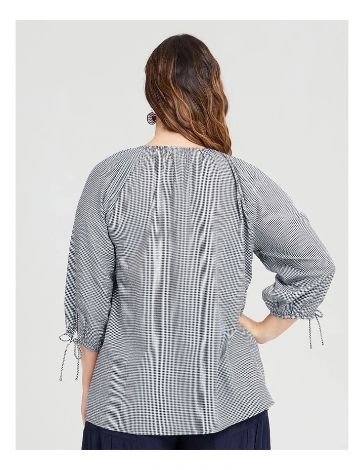 Express your style with the Seersucker Gingham Top! This curve-flattering top features on-trend gingham print for a fun and versatile addition to your wardrobe! Crafted from a breathable and lightweight viscose blend this plus-size top features a lovely v-neckline with tie front, 3/4 length sleeves with ties, and a curved hemline. Pair with your favourite leggings, jeans or culottes for a fun and flattering spring style.
