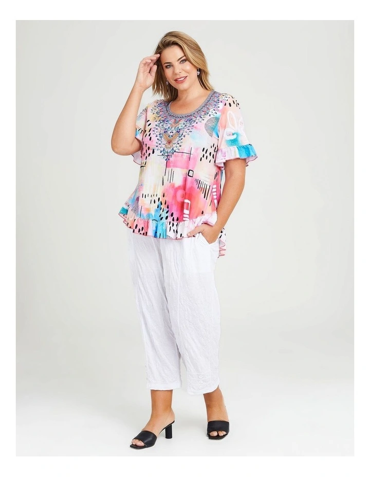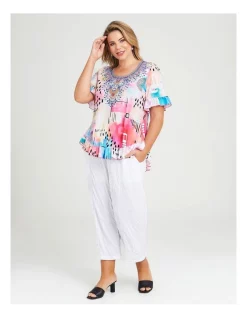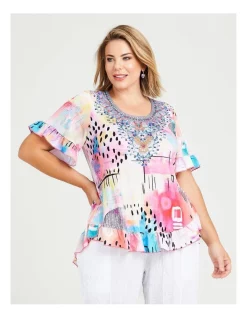 Get that effortlessly chic look with the Sparkle Ruffle Top and trust us when we say this will become one of your go-to tops this season! This plus-size top is designed with curves and comfort in mind, and features a seriously stunning, abstract print! Featuring a curve silhouette with round neckline with hot fix embellishment, and ruffle trim at hemline and sleeves. This top is perfect for all year round – keeps you feeling cool and comfortable in summer, and makes for a great layering piece in winter. Pair with your favourite jeans or culottes and head out feeling confident and fabulous!Β