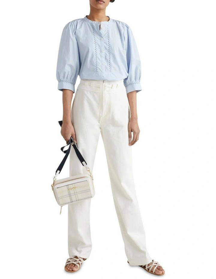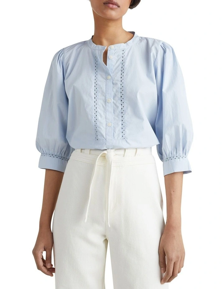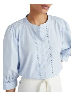 - Broderie anglaise detailing Henley neck Five-button placket One-button cuffs Tommy Hilfiger branding Relaxed Fit